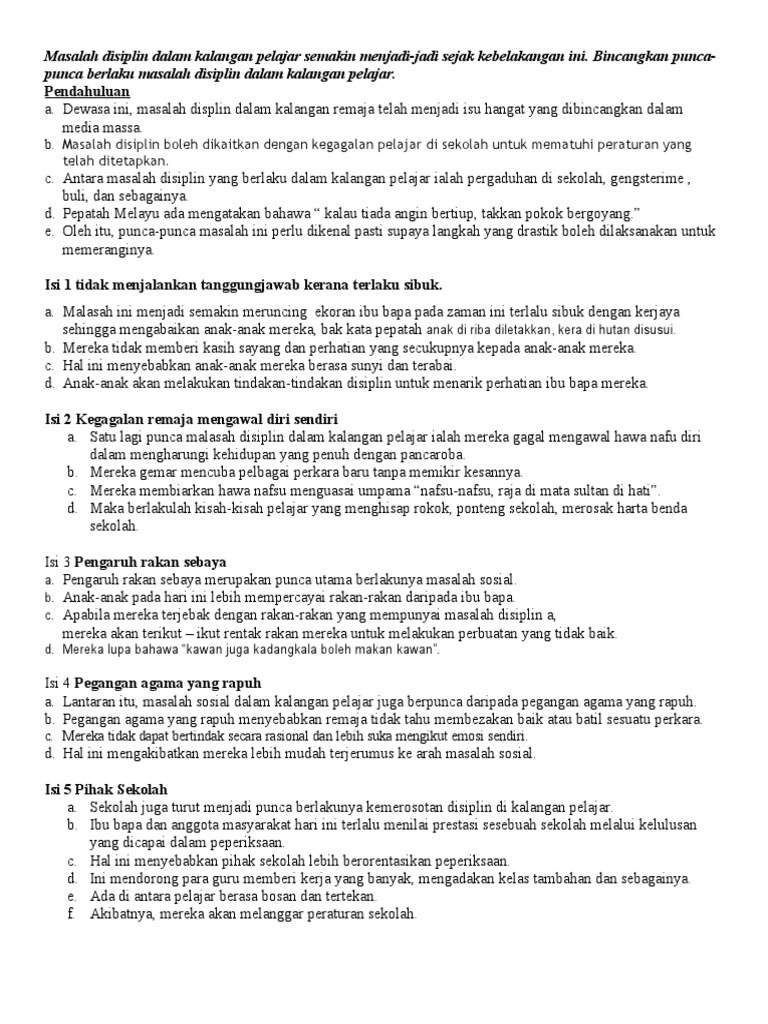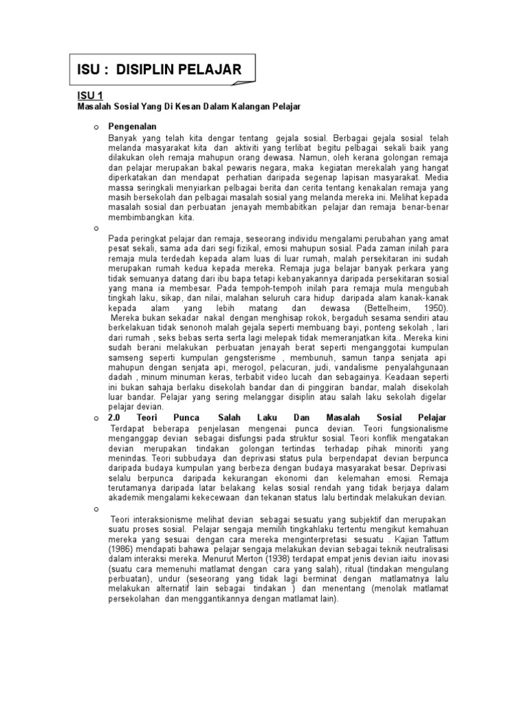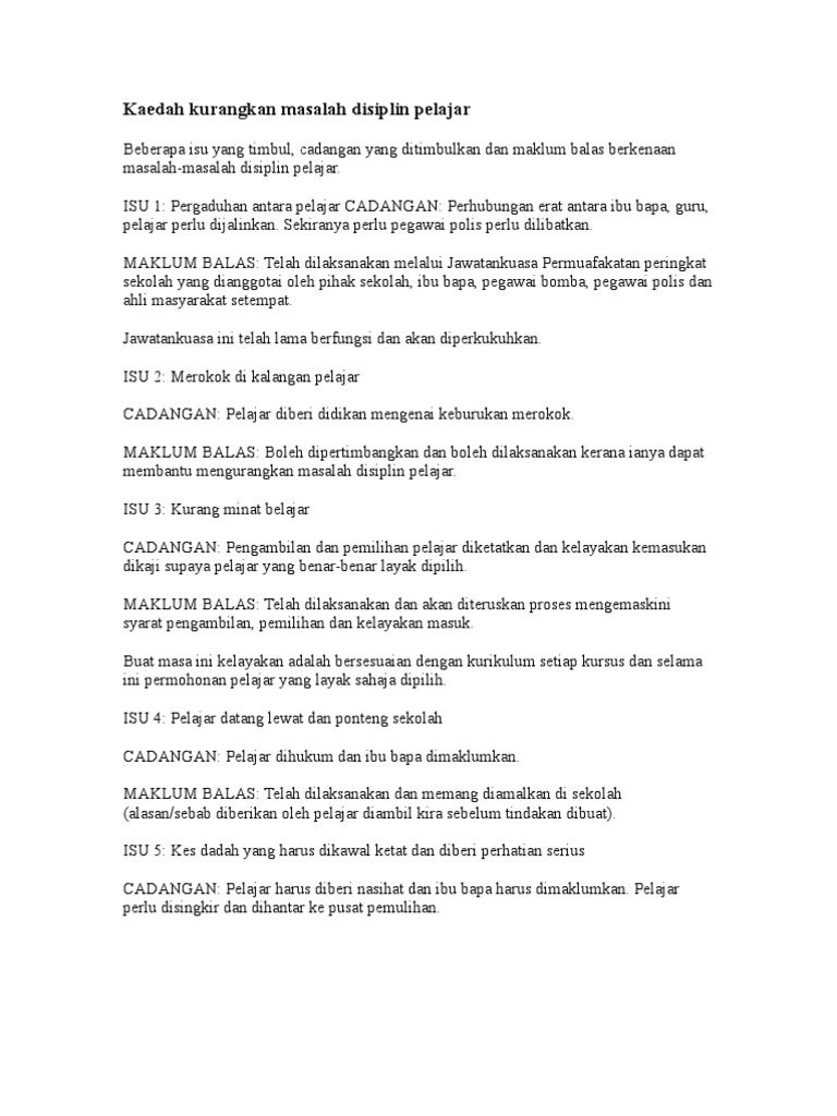 Ia bukan sahaja melibatkan pihak sekolah, kementerian. Kesimpulannya, masalah disiplin pelajar dapat diatasi sekiranya ibu bapa sentiasa menjalin hubungan yang erat dengan pihak sekolah. Pada tanggal 27 maret 2014: Kajian terhadap disiplin pelajar di sekolah menengah teknik olehnurul asyikinbinti mad yusuf penyelia: Ismail (2006), pelajar yang terlibat.